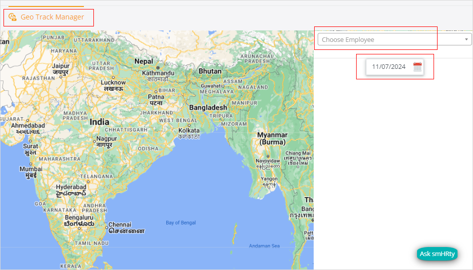 **Step 2**: Click on the ‘Geo Track Manger’ tab, ‘Choose Employee’ and the Date from the respective fields.&#x20;
