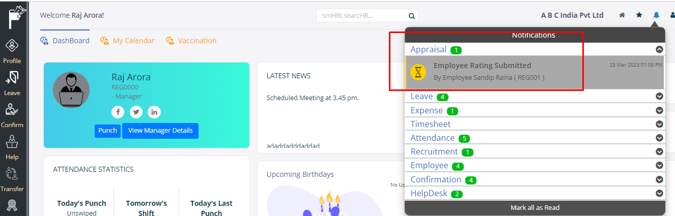 Managers will receive a notification once employee submits their ratings. The notifications can be viewed by clicking on the ‘Bell’ icon on the top right-hand corner of the ESS portal screen.