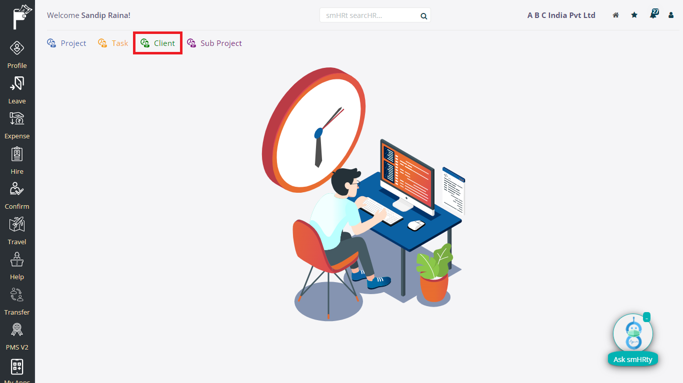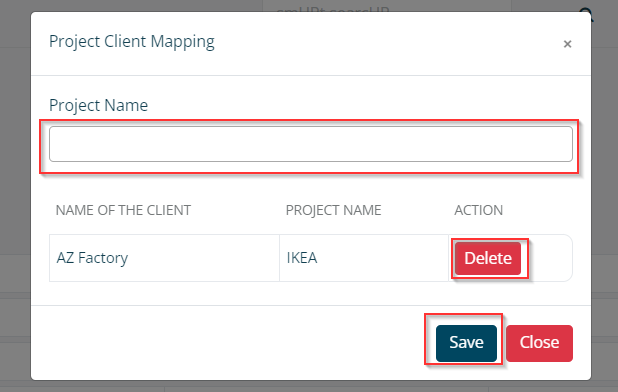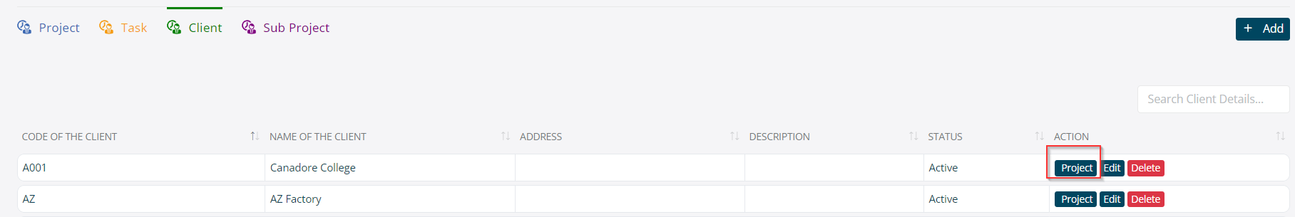 ***Note:** Once a client is created, assign a project to a client by clicking on the ‘Project’ button, entering the Project name, and then clicking on the ‘Save’ button.*