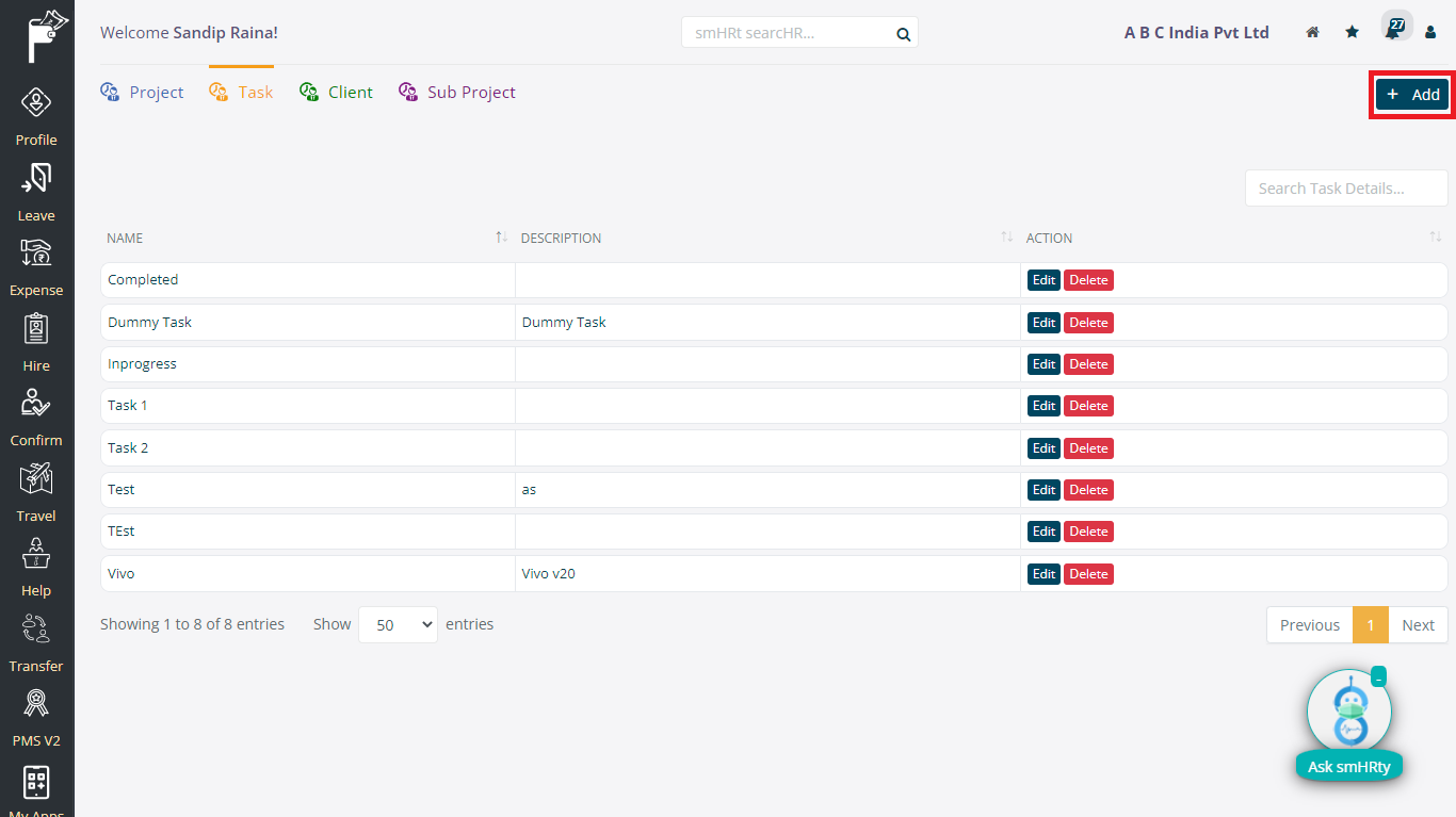 **Step 3:** Click on the ‘Task’ button adjacent to the project name for which you need to assign the task.