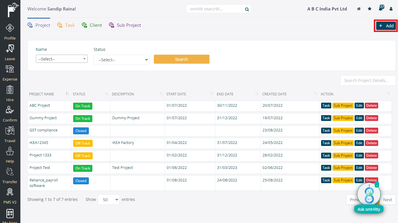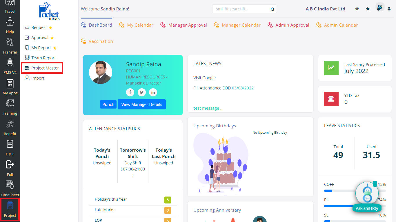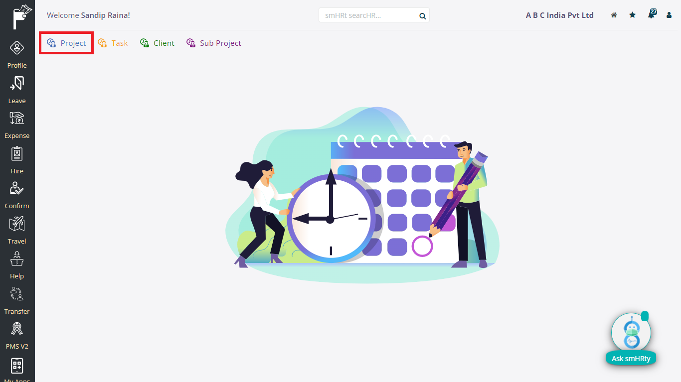 **Step 1:** Select ‘Project’ and then ‘Project Master’ from the left side menu.