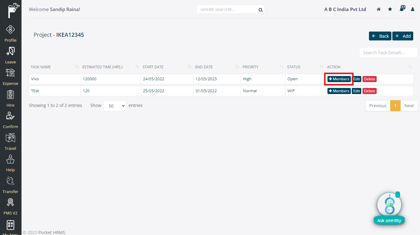 **Step 3:** Click on the ‘Task’ button adjacent to the project name for which you need to assign members.