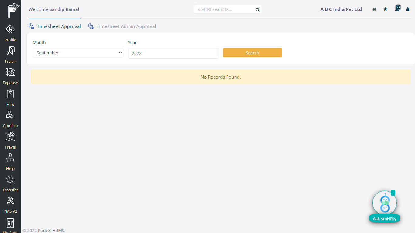 **Step 3:** Select the month and year and click on the ‘Search’ button to search for timesheet entries.