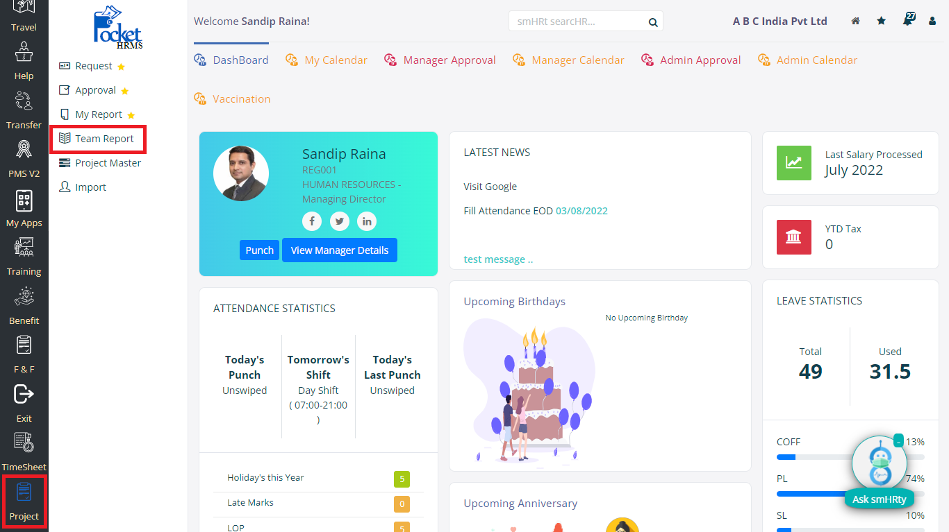 **Step 1:** Select ‘Project’ and then ‘Team Report’ from the left side menu.