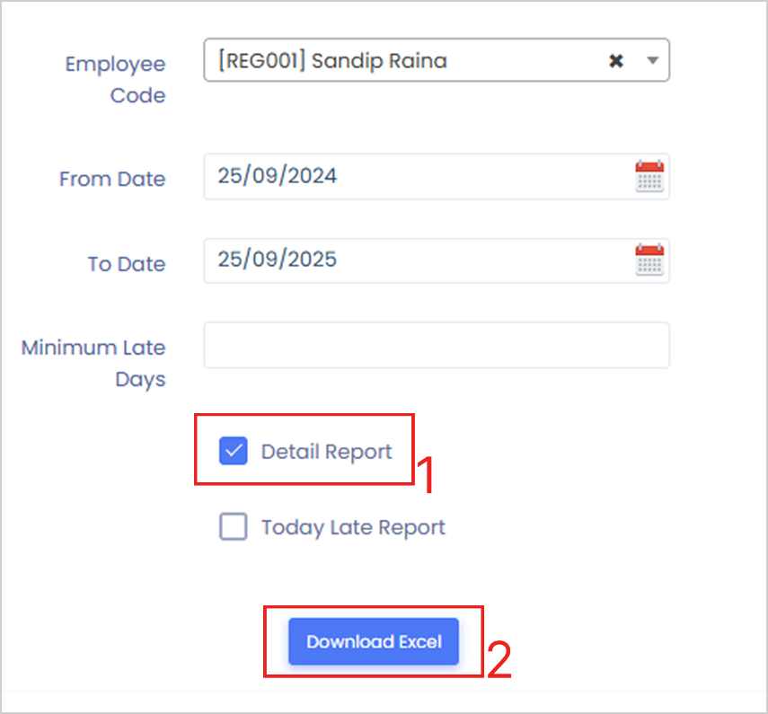 **Path:** Cloud portal > Analytics > Reports > Attendance > Late > Select category > Select employee > Select Date range > Select report type > Download Excel