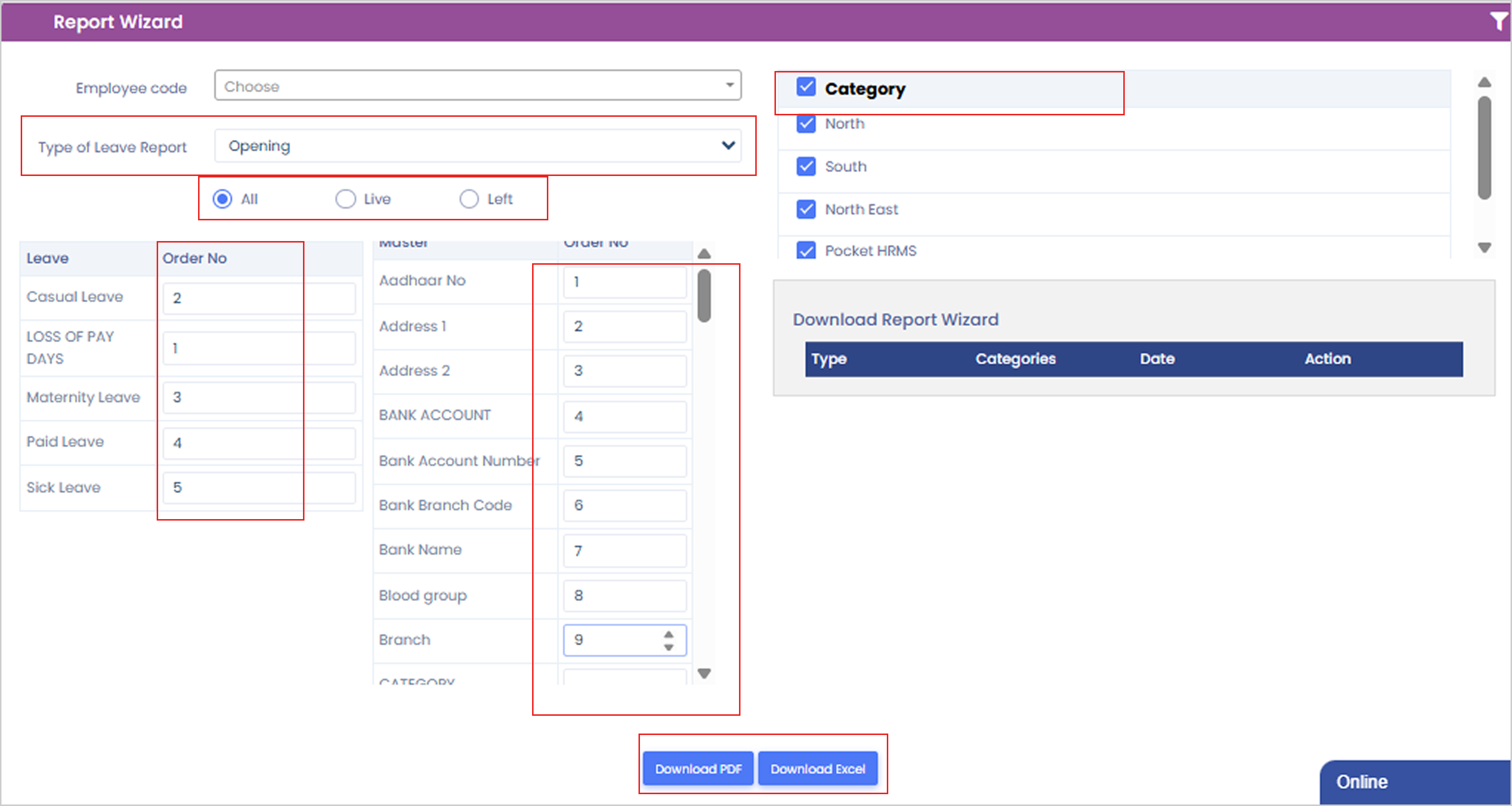 **Step 2**: Under the ‘Leave’ tab, click on the ‘Report Wizard’ subtab. Select Category, ‘Type of Leave Report’ and enter the order number for the respective leave as you want it to appear in the report and click on the ‘Download PDF’ or ‘Download Excel’ button and the report will be downloaded accordingly.