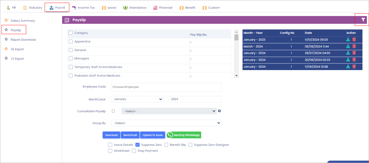 **Step 2**: Under the ‘Payroll’ tab, click on the ‘Payslip’ subtab and click on the ‘Filter Icon’ towards the upper right side of the screen.