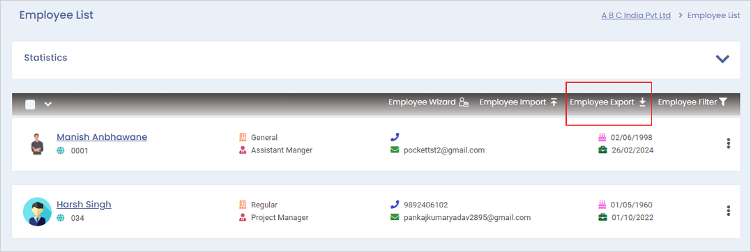 **Step 2**: Click on the ‘Employee Export’ option from the bar above the employee list and a pop-up will open.