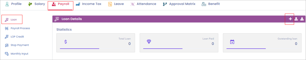 **Step 3**: Under the 'Payroll' tab select the ‘Loan’ subtab and click on the ‘+’ icon towards upper left side of the screen.