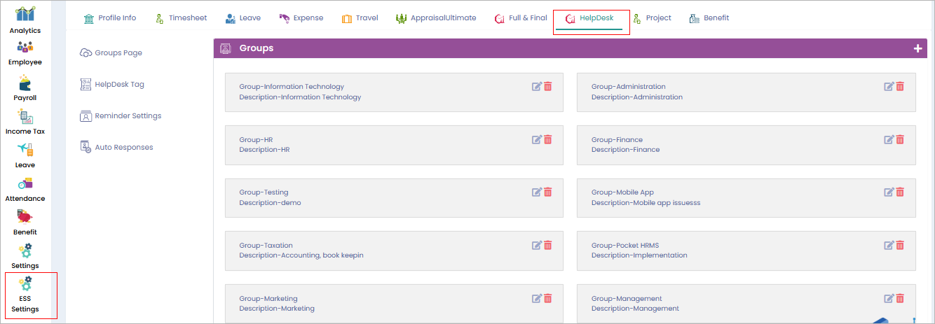 To check settings for the Helpdesk module, log into the cloud portal, go to the ‘ESS Settings’ and click on the ‘Helpdesk’ tab. Click on various subtab to do the respective settings.<br>