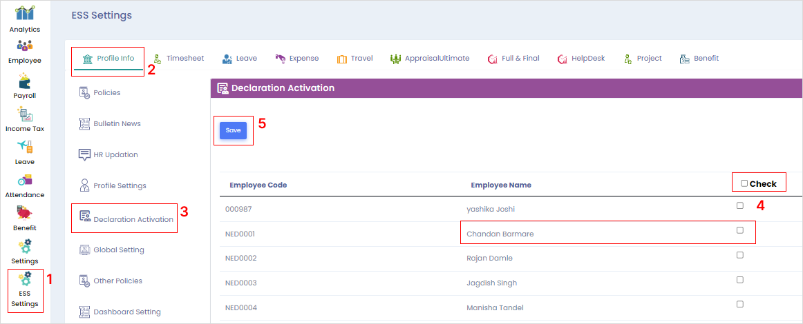 **Step 2**: You can tick respective boxes to select individual employees or tick the ‘Check’ box at the top to select all the employees. Click on the ‘Save’ button and income tax declaration window activation will be done accordingly.