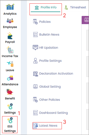 **Step 1:** Login to Cloud portal, go to ‘ESS Settings’ in the menu, select ‘Profile Info’ tab, and click on ‘Latest News’.