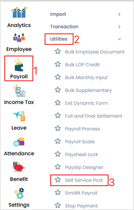 **Step 1:** Login to the cloud portal, under the ‘Payroll’ menu, select ‘Utility’ submenu, and then select ‘Self Service Post’.