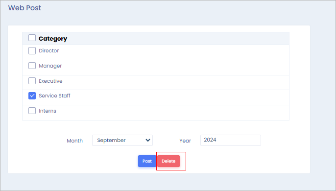 **Step 2**: Select the ‘Category’ and deselect the categories for whom you don’t want to release or restrict the payslip. Then select ‘Month’ and ‘Year’ from the respective fields and click on the ‘Post’ button. The payslip will be released or restricted accordingly.