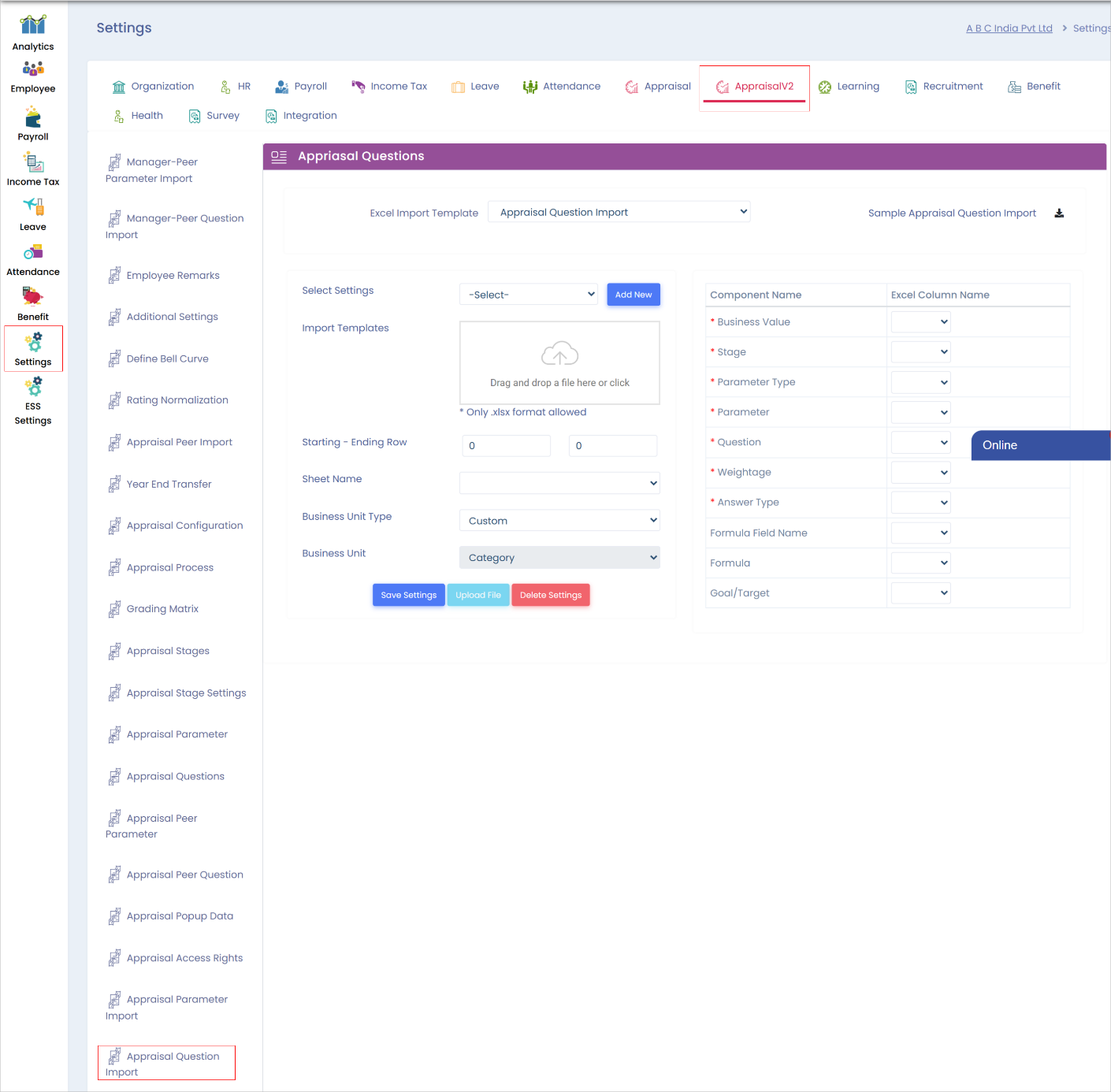 **Path:** Cloud Portal>Settings>Appraisal V2>Appraisal Parameter Import>Sample Appraisal Question Import>Select Settings/Add New>prepare file to be uploaded> fill in details>map components>Save Settings>Import Template>Upload File