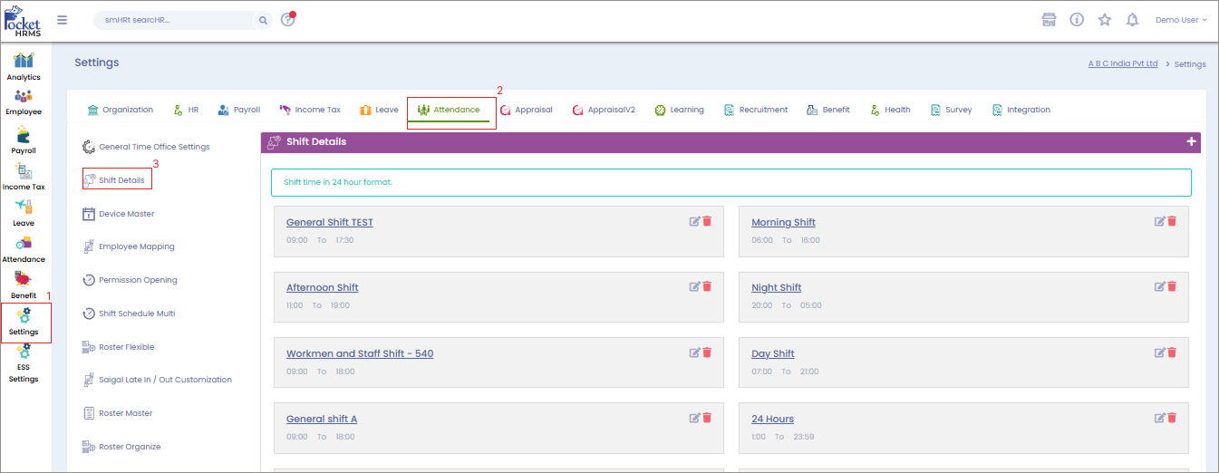 Link: <https://cloud.pockethrms.com/Settings/Employee/Index?module=attendance&submodule=ShiftDetails>