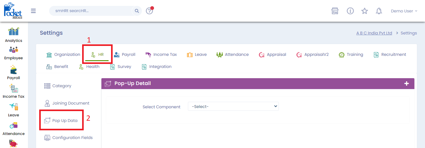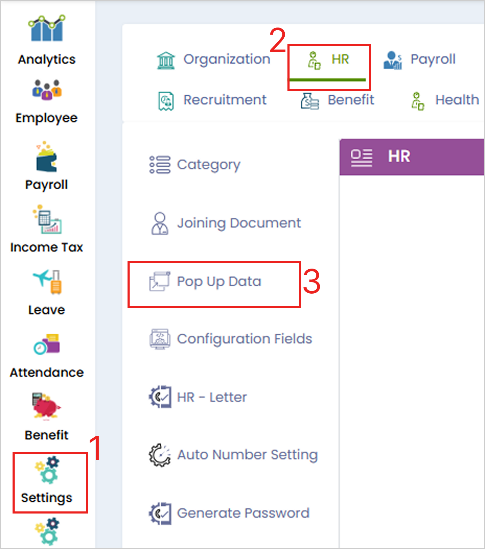 **Step 1:** Log in to the **Cloud portal**, go to **‘Settings’**, under the **‘HR’**, tab select **‘Pop-up data’**.