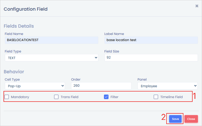 **Path**: Cloud Login > Go to settings > HR > Configuration Field > click on '+' and create a Field as Base Location > label name as Base Location > Field type as Text > Cell type as Pop-up Panel as Employee > Enable the check box as required > Save