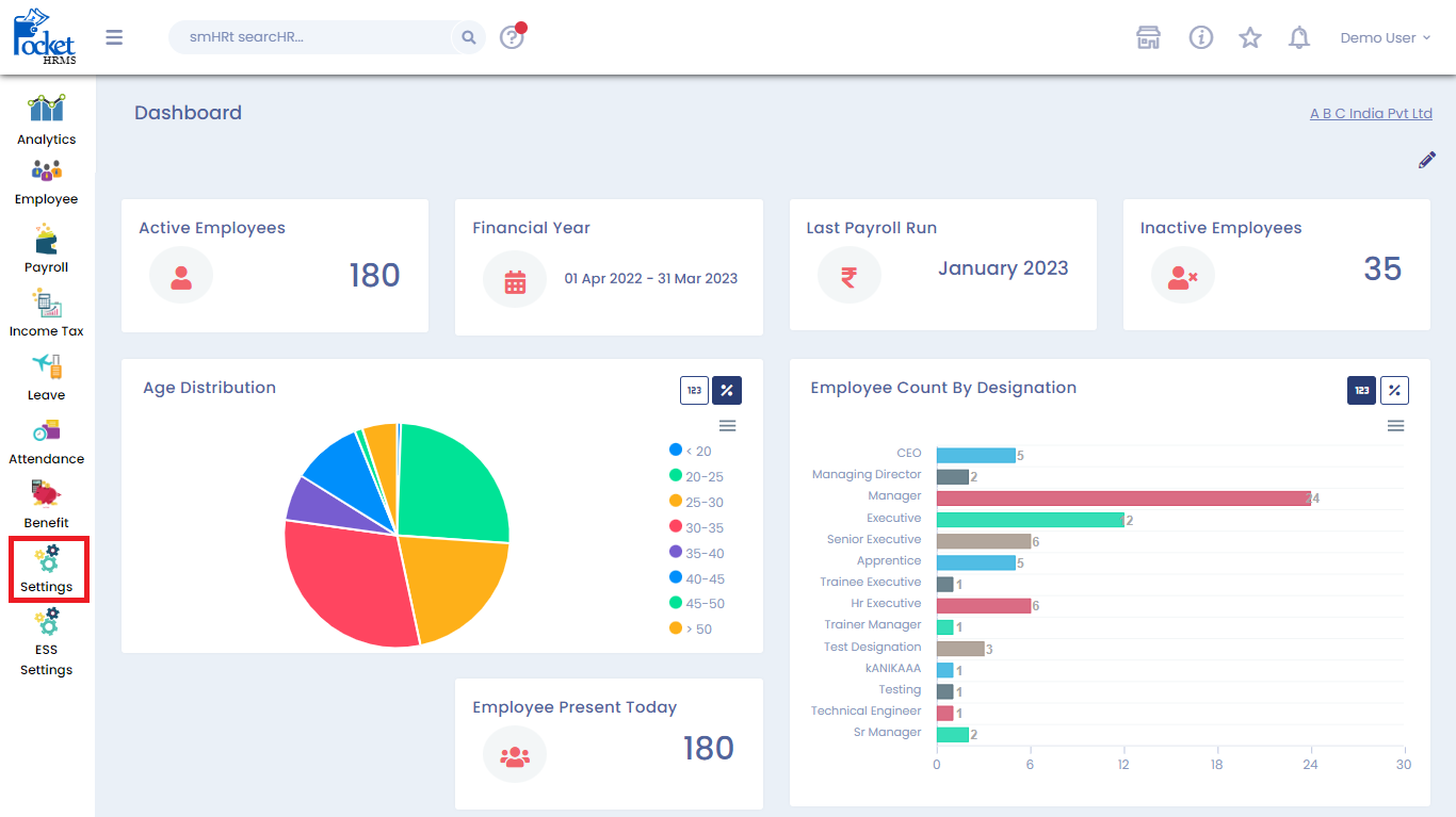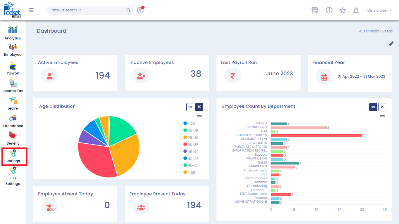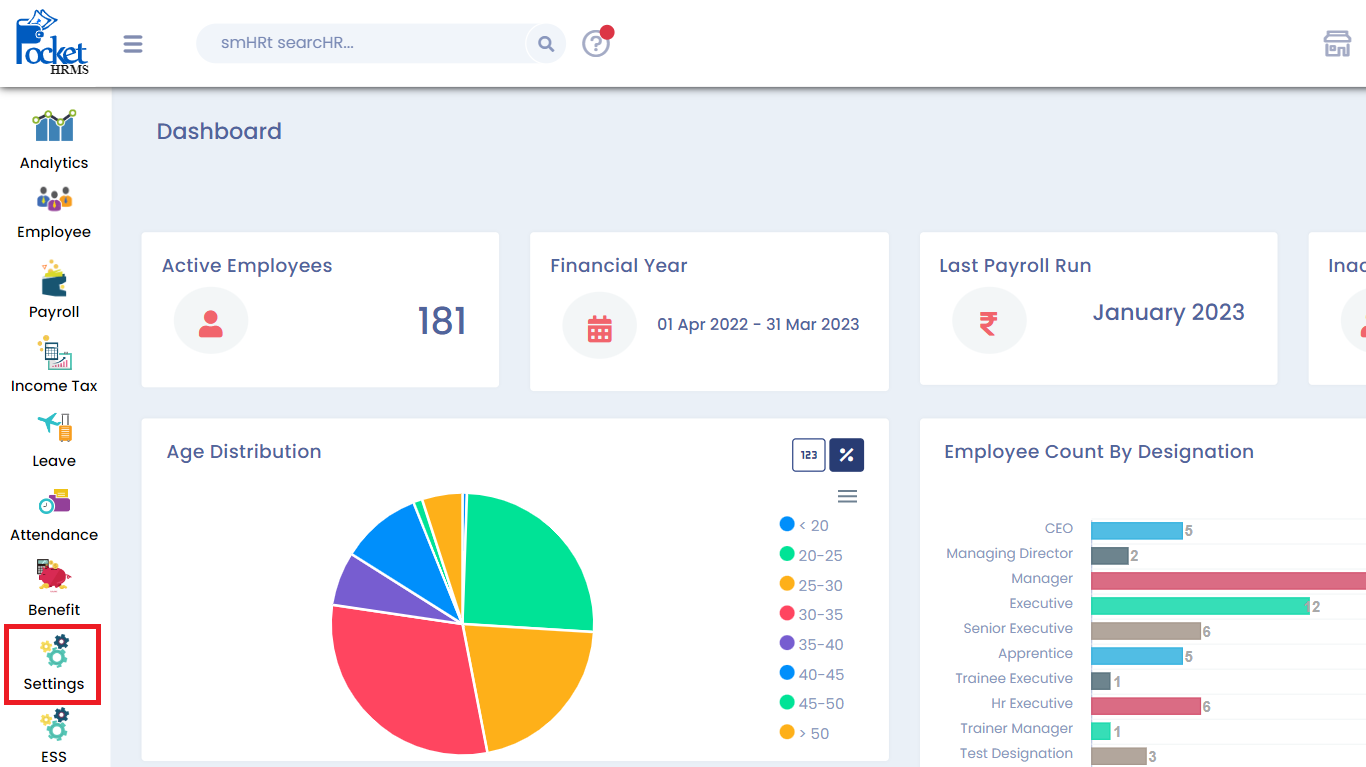 Log into the Pocket HRMS cloud portal, with administrator’s rights. Click on the ‘Settings’ menu at the right side of the screen, that will take you to the settings screen.