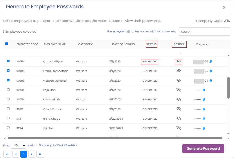 **Step 3:** Select the ‘Employee Codes’ by ticking on the side of the selected employees for whom you want to generate/re-generate the password and click on ‘Generate password’.