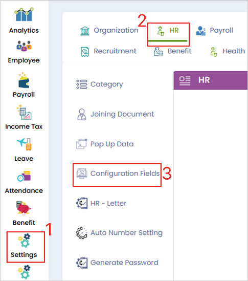 **Step 1:** Log in to the **Cloud portal**, go to **‘Settings’** menu, select **‘HR’ tab**, and then under it click on **‘Configuration Field’** option.