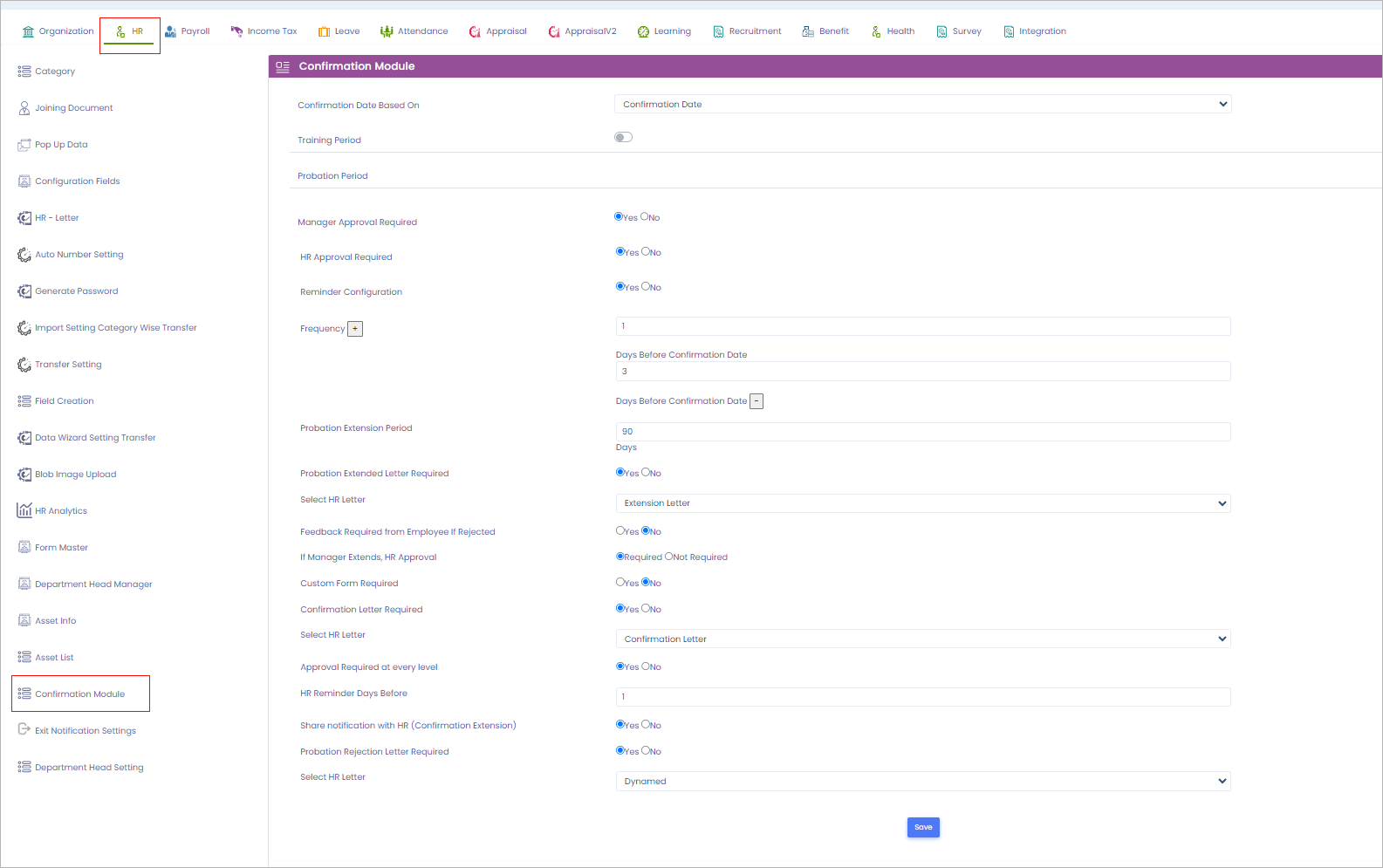 **Link**: <https://cloud.pockethrms.com/Settings/Employee/Index?module=hr&submodule=ConfirmationSetting>
