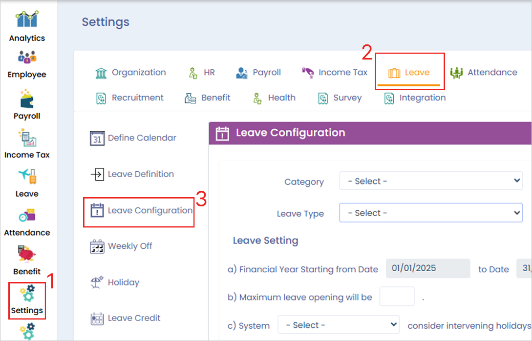 **Step 1:** Login to cloud portal, go to ‘Settings’ menu, under the ‘Leave’ tab, select ‘Leave configuration’ option.
