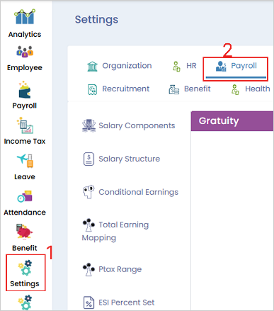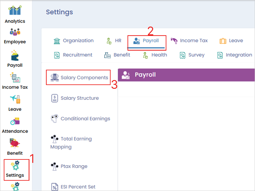 **Step 1:** Log in to the **Cloud portal**, go to **‘Settings’ menu**, select **‘Payroll’ tab**, and then click on **‘Salary Component’**.