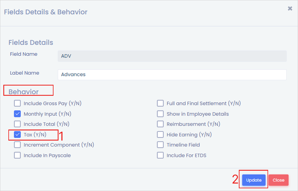 **Step 3:** In the **‘Behaviour’** section, enable the checkbox for **‘Tax’**, and Click the **‘Update’** button to save the changes.