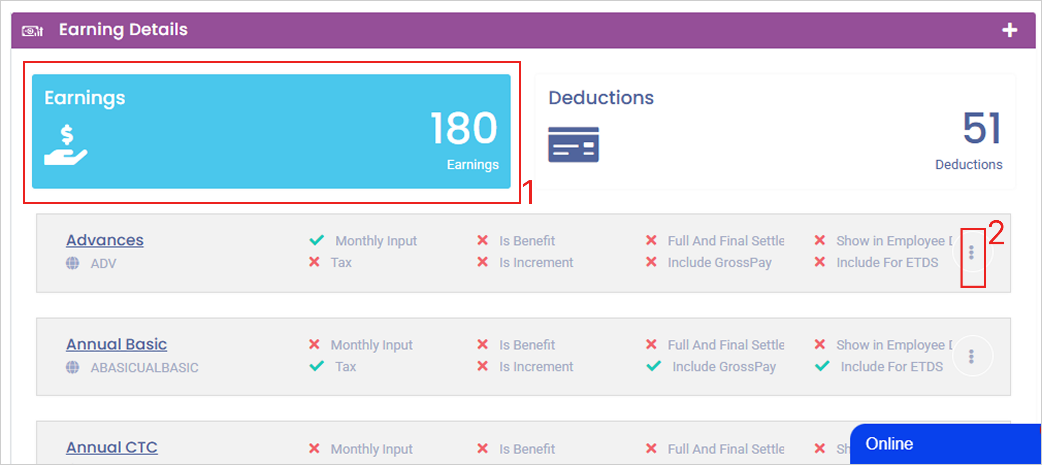 **Step 2:** In the ‘**Earning**’ field, locate the component you wish to modify. Click the ‘**three-dots’ icon** next to its name and select **‘Edit’**.