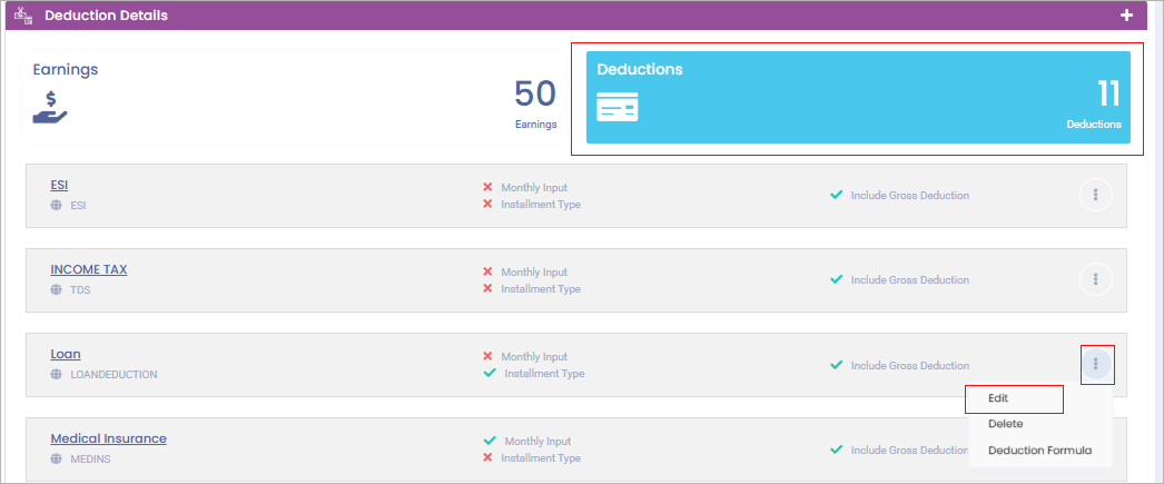 **Step 2**: Click on the ‘Deductions’ sections then find the Loan component in the list, click on the respective ‘3 Dots’ and select the ‘Edit option’.