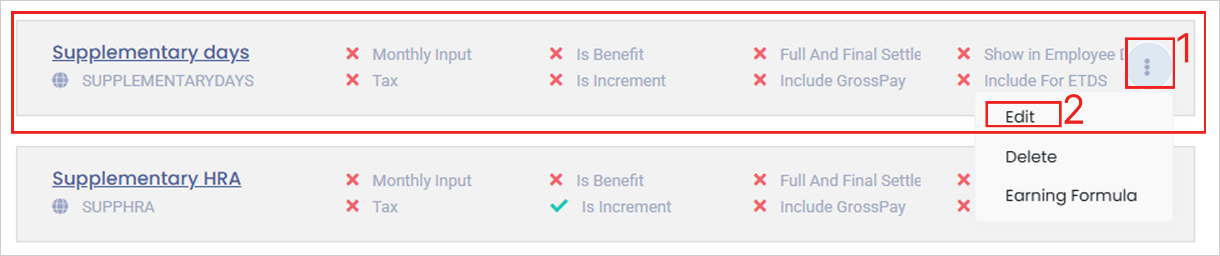 **Step 1:** In the '**Same component**' that is ‘**Supplementary days’**, click on the three dots. And select '**Earning formula**'.