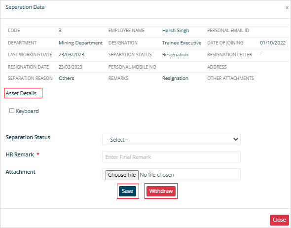 **Step 3**: Here you can view the separation details, update ‘Asset Details’. Select the ‘Separation Status’ and enter the ‘Remark’, ‘Choose File’ to be uploaded if required and click on the ‘Save’ button. The employee separation process will be completed accordingly.<br>