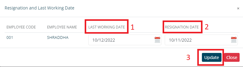 **Step 4:** Make necessary changes in the ‘Last Working Date’ and ‘Resignation Date’ and click on the ‘Update’ button to save the changes.