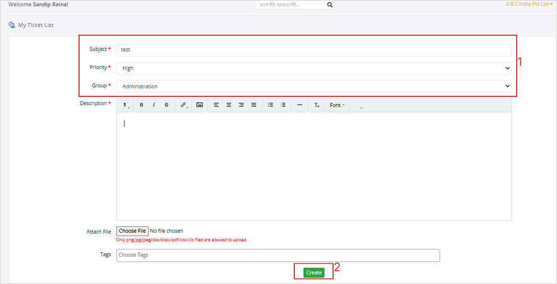 Path: Login to ESS portal > go to Help module > My Tickets > My ticket list > Click on Add + > Edit the details in fields which are mandatory > Create Ticket