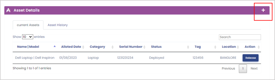 Now the asset you just added will be visible under the ‘Current Assets’ tab. To remove an asset from an employee you need to click on the ‘Release’ button.