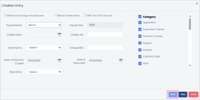 Click on the ‘+’ button to add the month-wise challans. A pop-up window will open.