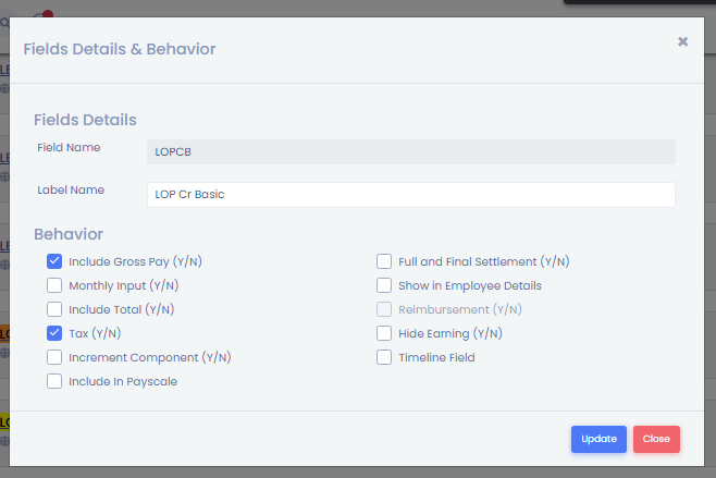 **Step 4:** Fill in ‘Field Name’, and ‘Label Name’, and select ‘Behaviour’ as shown in the snapshot below.
