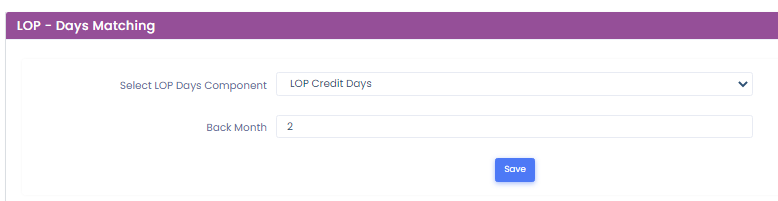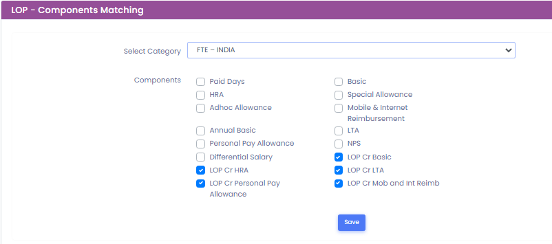 **Path: Setting>Payroll>Pay Setting> LOP - Components Matching>Select Category>Select Lop Credit Component >Save**