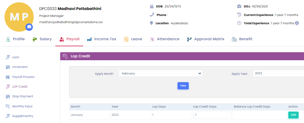 **Path: Employee Account>Payroll>LOP Credit>Month>view>LOP Credit Days-Put days>Action- Add**