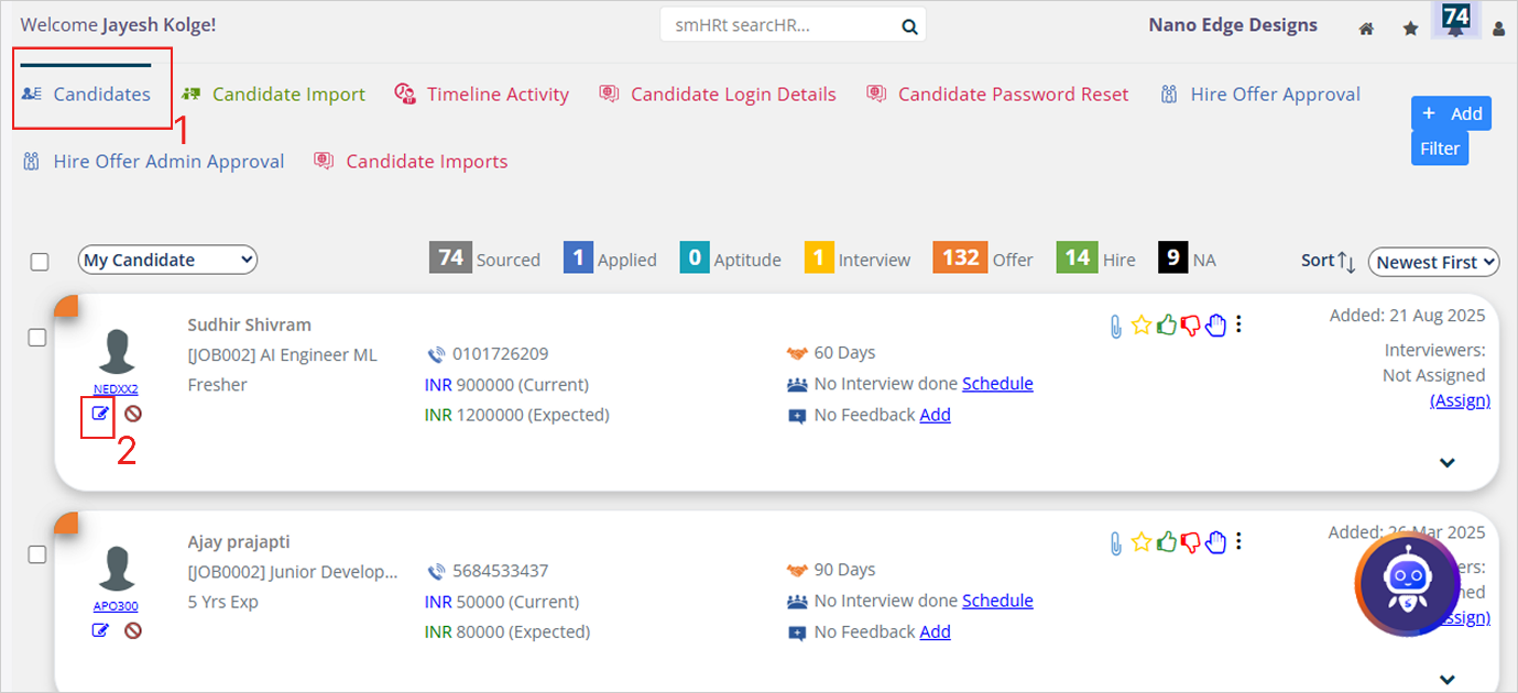 **Step 2:** Select ‘Candidates’ tab, and click on the ‘Edit icon’ below the employee card.