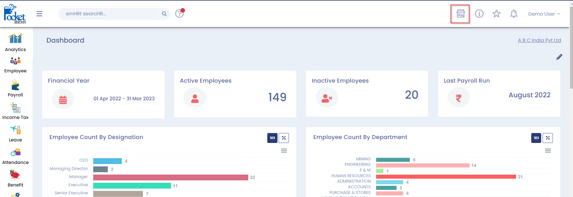 **Step 2:** Go to the ‘Pocket HRMS Marketplace' by selecting the marketplace icon at the top right corner of the page.
