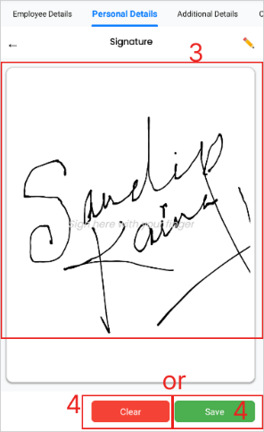 **Path:** Login to Pocket HRMS 2.0 Mobile app > click on 3 horizontal lines (Hamburger menu) > Profile > My Profile > Personal Details > You can edit your details from here > Save > In show HR Update you can view HR update information > Click manage signature > click on pencil icon to edit digital signature > Save or clear to delete and add new.