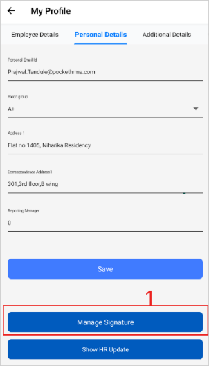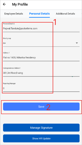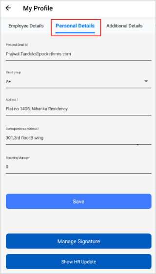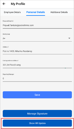 **Path:** Login to Pocket HRMS 2.0 Mobile app > Profile Icon > Basic information > Personal Details > You can edit your details from here > Save > In show HR Update you can view HR update information > Click manage signature > click on pencil icon to edit digital signature > Save or clear to delete and add new.