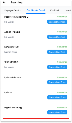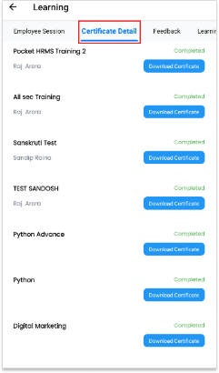 **Path:** Login to mobile app of Pocket HRMS 2.0 > click on 3 horizontal lines (Hamburger menu) > Training > Learning > Certificate Detail > You can view all the completed learning certificates here > Click on Download to download any certificate.